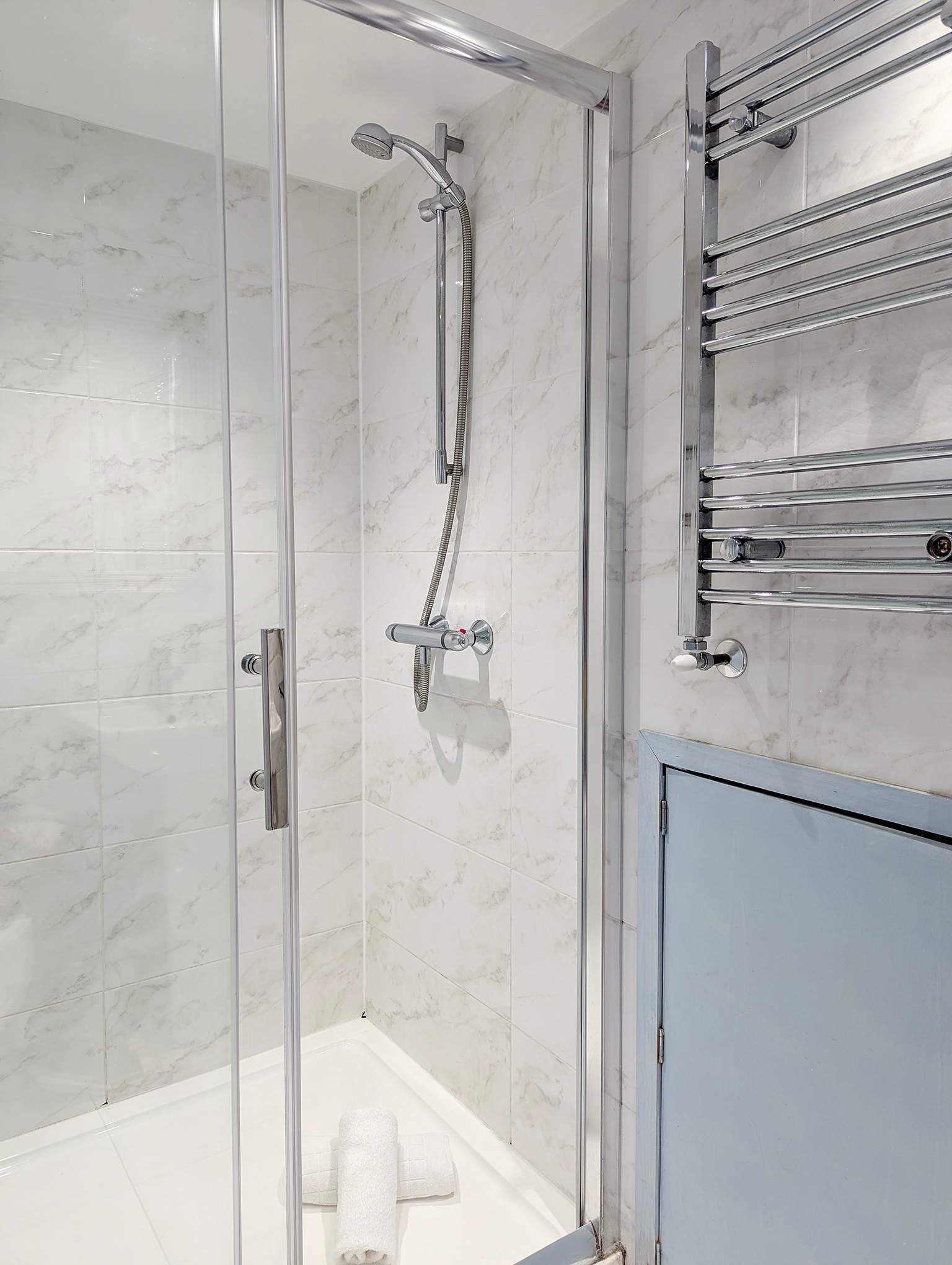 En suite to Bedroom 3, featuring a shower cubicle, WC, wash basin, and heated towel rail.
