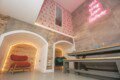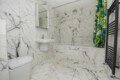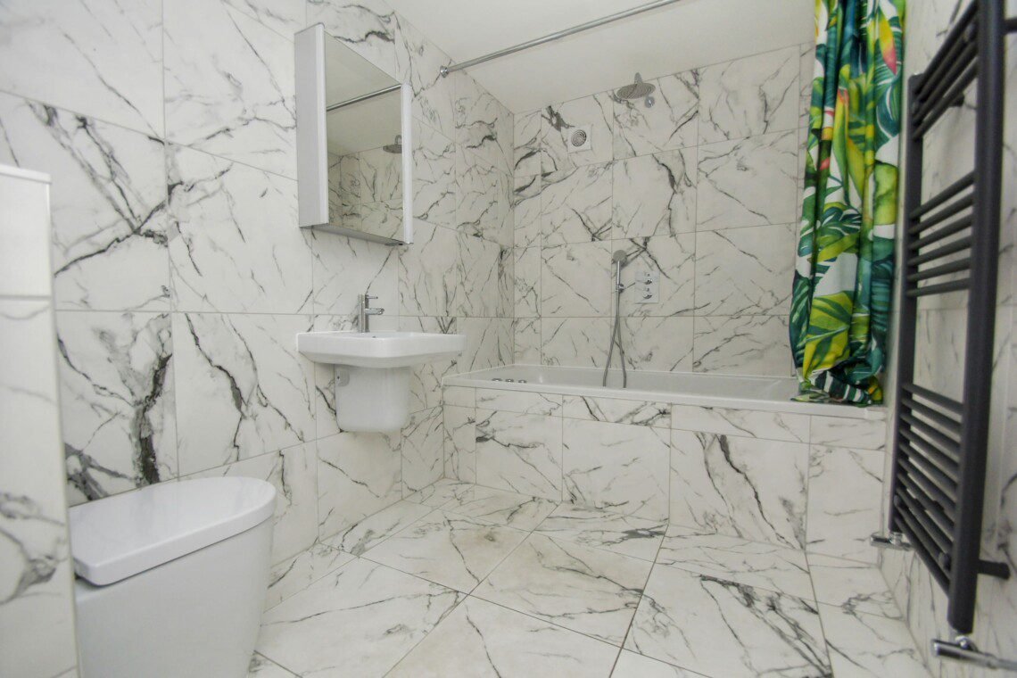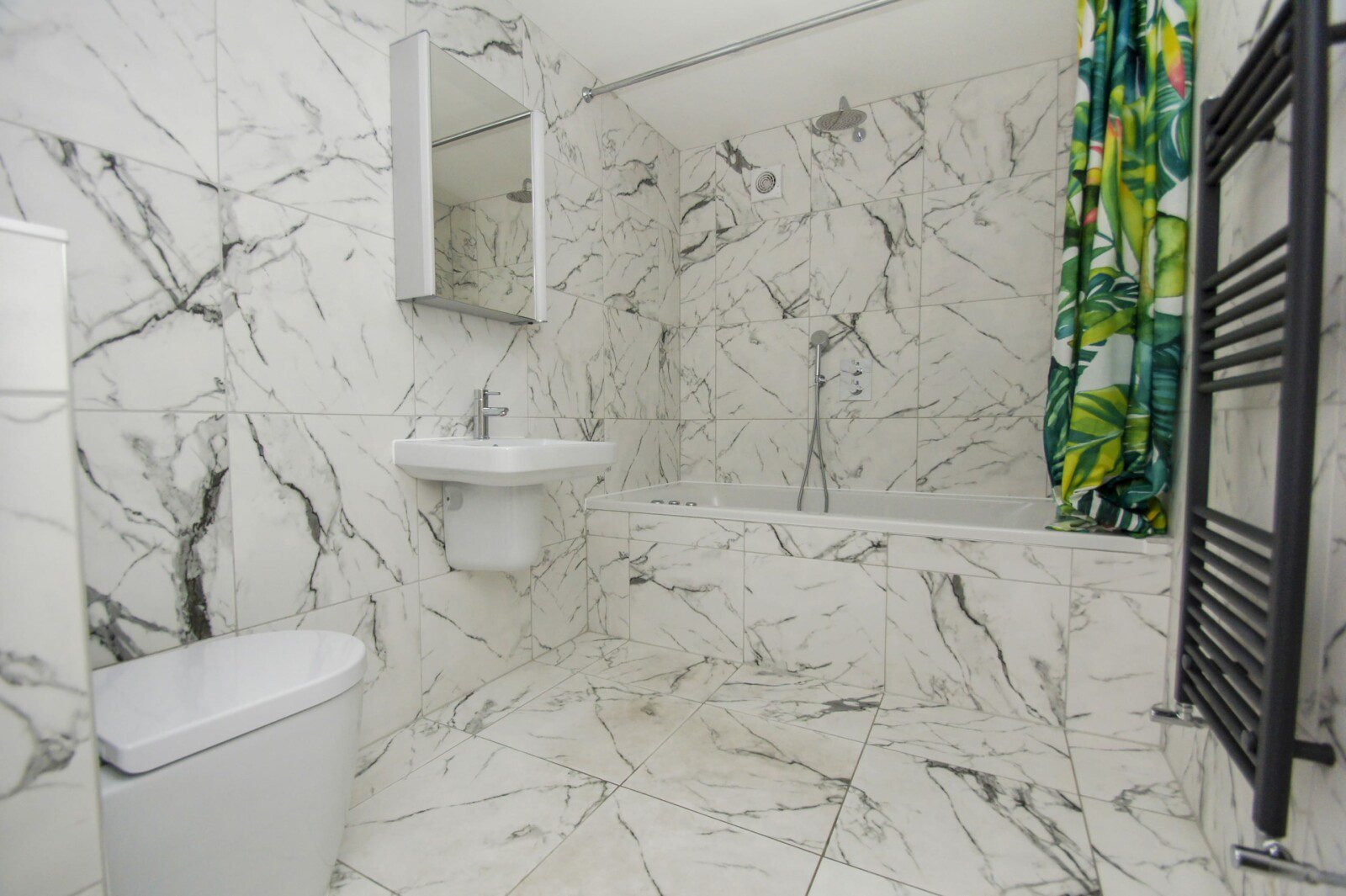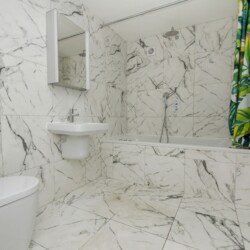 A luxurious marble-effect bathroom with a large Jacuzzi bath—perfect for a relaxing soak after a day of hen weekend activities. Also features a rainfall shower, a handheld shower, sink, mirrored cabinet with storage, heated towel rail, and toilet.