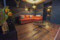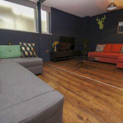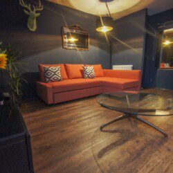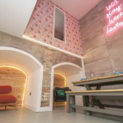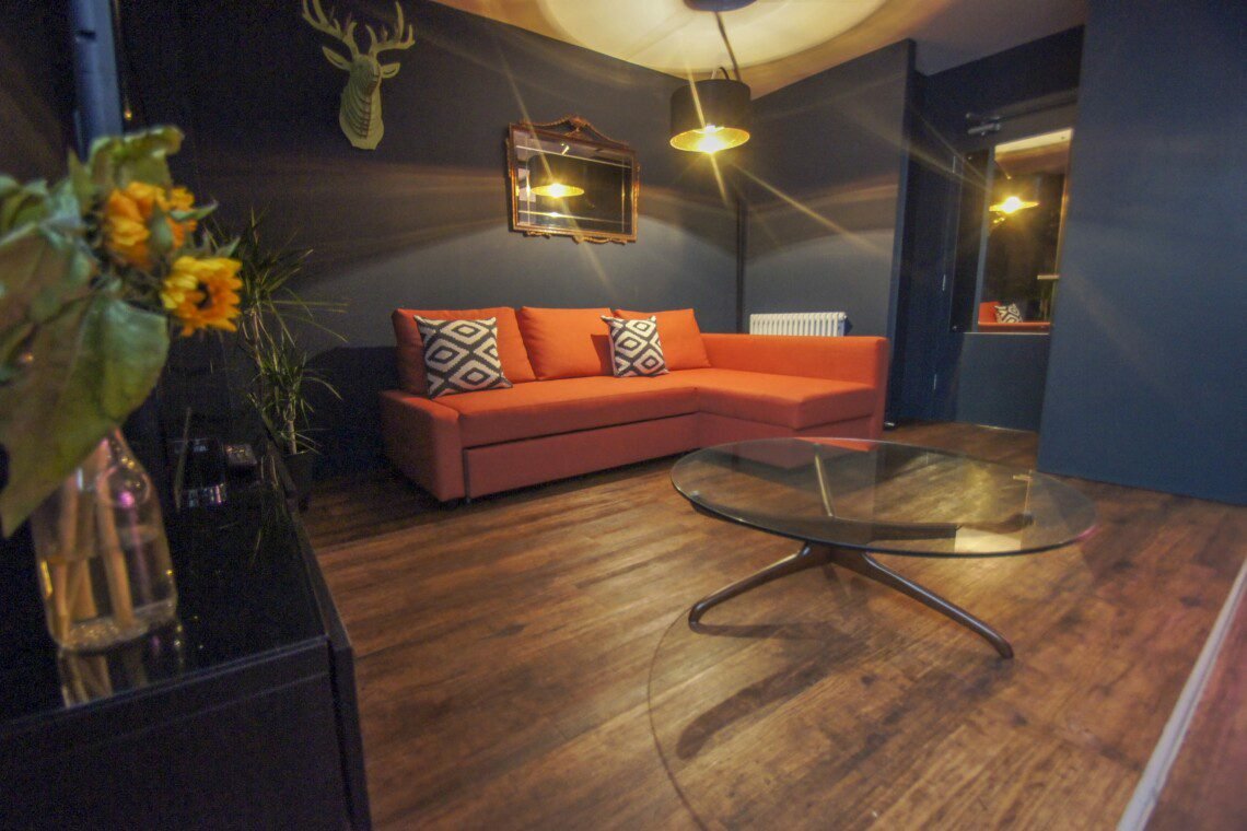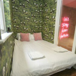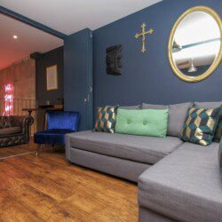 A cosy and quirky space featuring a double sofa bed, funky themed wallpaper, and a relaxed vibe—ideal for catching up on beauty sleep before another day of hen do activities.