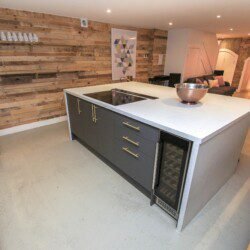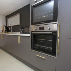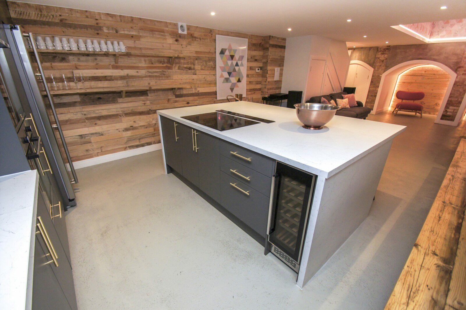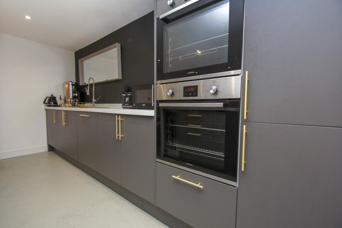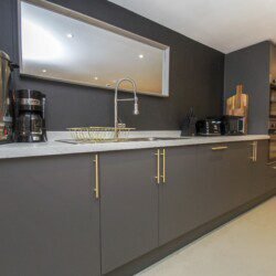 A modern, fully equipped kitchen featuring sleek charcoal grey units, white stone worktops, and integrated appliances. From the wine cooler for chilled prosecco to the American-style fridge freezer, two fan ovens, five-ring hob, and filter coffee machine, everything is set up for a stress-free hen weekend. There’s even a hot water dispenser for that all-important morning cuppa.