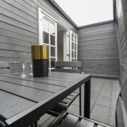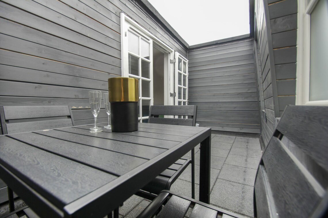 Double doors lead out onto a private terrace with a table and four chairs—an ideal spot for a chilled glass of bubbly, enjoying the fresh sea air, or catching up with friends before heading out.