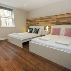 A trendy space with two double beds and an en suite shower room. Includes a copper-pipe clothes rack, hanging rail, and chest of drawers—plenty of space for outfit changes and getting ready for a night out.