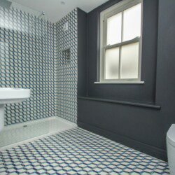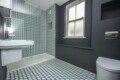 En suite to Bedroom 3, this double walk-in shower features a rainfall shower, handheld shower, sink, mirrored storage cabinet, heated towel rail, and toilet.