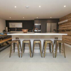 A stylish midnight-blue lounge designed for relaxing with the hens. Two plush corner sofas convert into double sofa beds, sleeping four more guests. Bi-fold doors allow the space to be split into two private sleeping areas. With a TV and a selection of board games, it’s perfect for a laid-back evening after a fun-filled day.