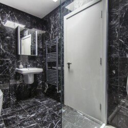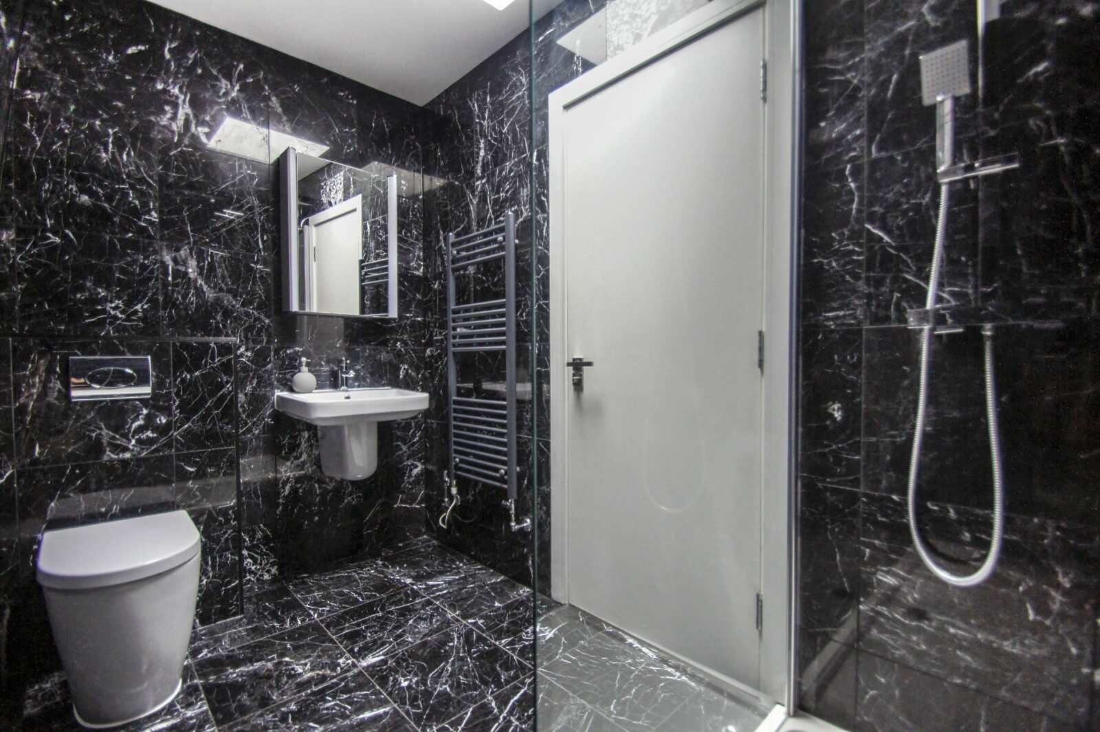A chic black-marble bathroom with a double walk-in shower, sink, mirrored storage cabinet, heated towel rail, and toilet.